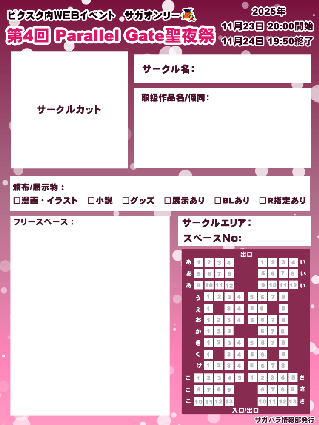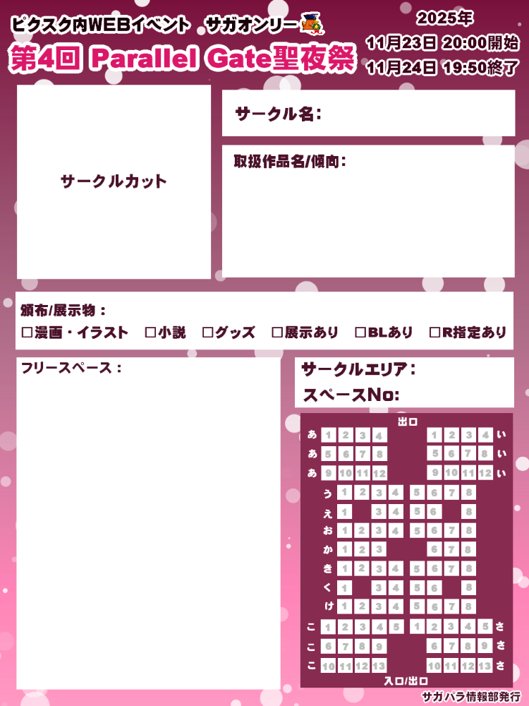 サガパラ聖夜祭のサークル参加シートです。お好きな方をお使い下さい。Xやmixi2にアカウントをお持ちでない方は、主催にサークル参加シートを提出していただきますとX/mixi2にポストさせていただきますのでご活用下さい。※Xのみでポストして欲しいなど、ご期待あればご連絡下さい。配置図とエリアは下図を参照下さいませ。